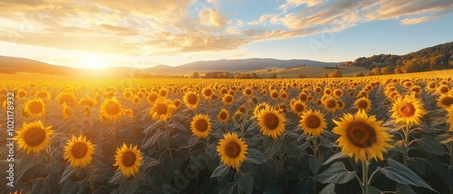 Vast sunflower field at sunset with golden hues illuminating the landscape and scattered clouds in the sky.
