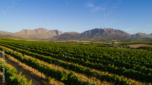 Vast vineyard rows in Wellington, South Africa, framed by a mountainous horizon under a clear blue sky, showcasing the region's wine-producing landscape.