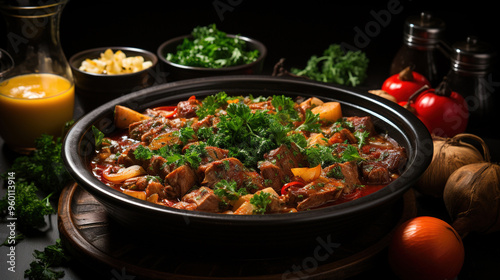 Veal Stew with Fork Knife and Condiments On Dark Black Blurry Background