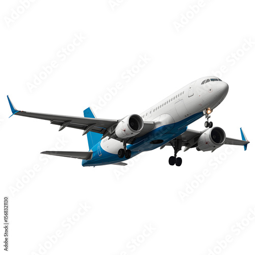 aeroplane, plane, aircraft, jet, travel, flight, transportation, blue, white, wing, engine, landing, isolated, transparent, background, illustration, three-dimensional, rendering, aviation, airline, aerodrome, sky, cloud, journey, alpha