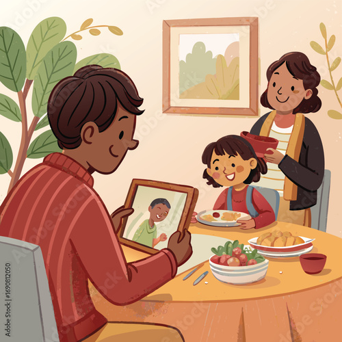 family, dinner, meal, home, together, cartoon, technology, connection, communication, love, happiness, portrait, frame, table, food, plate, chair, room, wall, art, drawing, design, graphic, digital, lifestyle, indoor, plant, window, mother, father, children, daughter, son, eltern, sibling, human relationships, culture, ethnicity, diversity, community, support, care, share, moment, memory