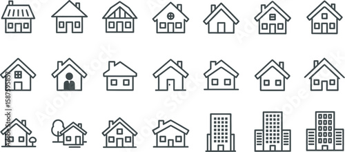 Vector art of a set of outline icons depicting various house and building styles isolated on white background