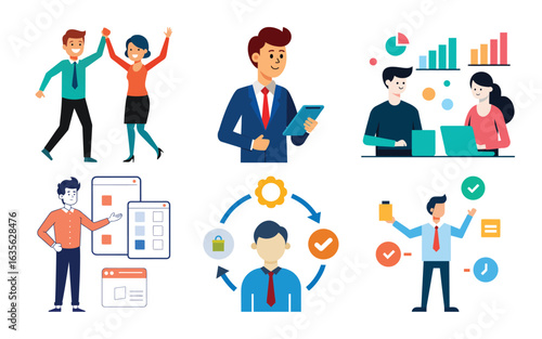 Vector art of business people engaged in various work activities, including meetings, planning, and achieving goals through efficient processes