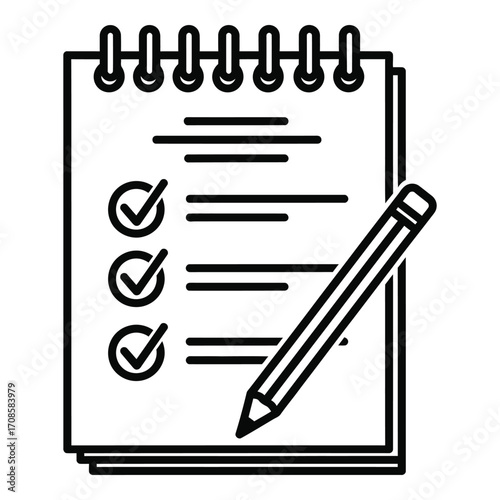 checklist, list, check, mark, crayons, paper, note, task, planning, organisation, management, business, office, work, school, education, reminder, schedule, agenda, appointment, document, form, survey, questionnaire, report, datum, information, symbol, signs, graphic, design, art, drawing, isolated, white, background, black, outline, line, minimalist, simple, flat, style, clipboard