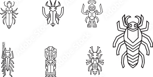 ancient, tribal, symbol, glyphs, pattern, design, art, graphic, figure, creature, animal, insect, android, mythical, legendary, cultural, heritage, traditional, ethnic, origin, history, past, era, period, style, form, shape, outline, line, black, monochrome, simple, minimalist, abstract, geometric, ornate, detailed, unique, distinct, various, multiple, set, group, collection, series, display, visual, vector, illustration