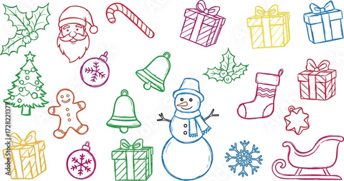 christmas, santa, snowman, reindeer, tree, gift, present, holly, berry, leaf, bell, candy, cane, gingerbread, man, sock, stocking, ornament, bauble, snowflake, sleigh, sled, winter, holiday, season, celebration, festive, greeting, card, design, element, symbol, drawing, vignetting, doodle, hand, drawn, scribble, chalk, wax crayons, colours, bright, cute, simple, flat, clip art, art