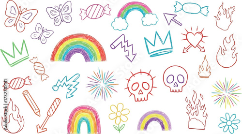 Vector art of collection of handdrawn doodles of rainbows, butterflies, skulls, and crowns