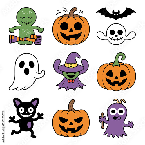 halloween, pumpkin, ghost, bat, monster, cute, cartoon, skittish, holiday, orange, white, black, purple, green, isolated, funny, character, design, clip art, illustration, drawing, decoration, autumn, celebration, trick, treat, scarey, icon, symbol, graphic, element, party, season, october, evil, creature, mask, fear, night, collection, vector, set, hat, horror, cat, sorcerer, face, silhouette, skull