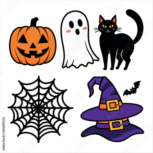 Vector art of halloween themed clip art with pumpkin, ghost, cat, and witch hat isolated on white