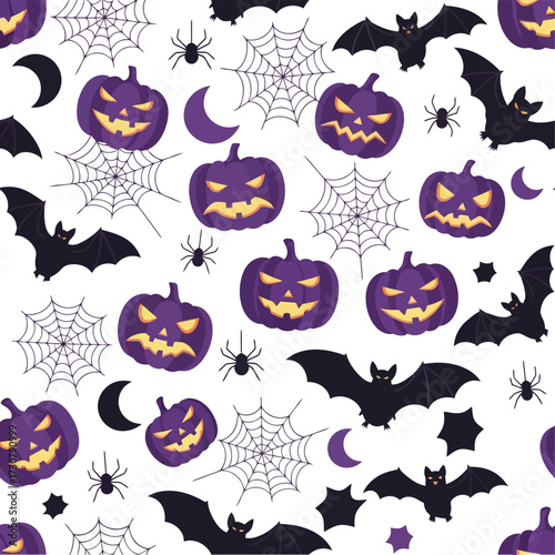 Vector art of seamless pattern with purple pumpkins, spiders, and bats