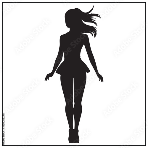 woman, girl, figure, person, female, silhouette, black, hair, coiffure, fashion, style, dress, skirt, arm, hand, pose, standing, graphic, design, element, art, drawing, character