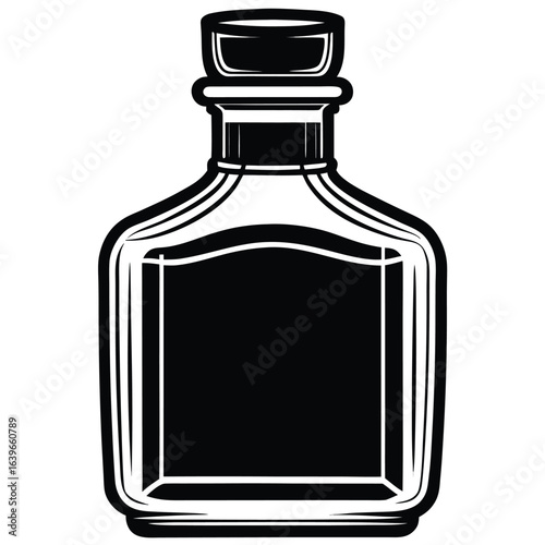 Vector art of square glass bottle with cork stopper filled with liquid, isolated on white background