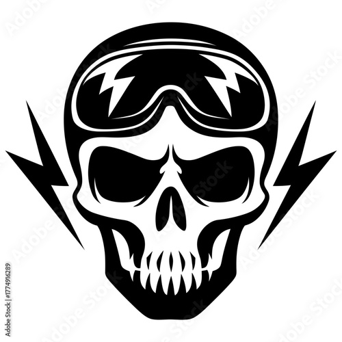 Vector Art Skull with Motorcycle Goggles and Lightning Bolts for Tattoo Emblem or Logo Design