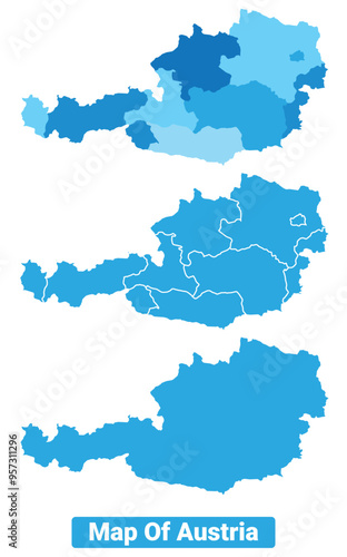 Vector Blue Austria political maps with borders regions simple flat illustration set