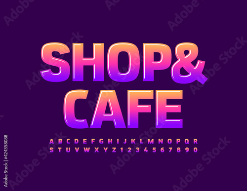 Vector bright emblem Shop and Cafe. Creative glossy Font. Gradient Alphabet Letters and Numbers set