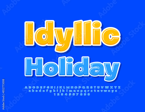 Vector bright flyer Idyllic Holiday.. Blue Glossy Font. Decorative Alphabet Letters and Numbers.