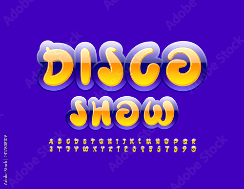 Vector bright poster Disco Show. Artistic Glossy Font. Playful Alphabet Letters and Numbers