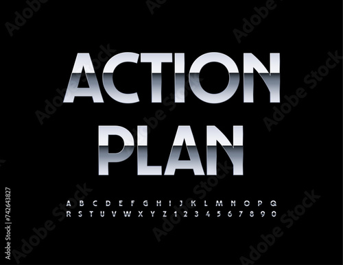 Vector business emblem Action Plan. Modern Silver Font. Set of Metallic Alphabet Letters and Numbers.
