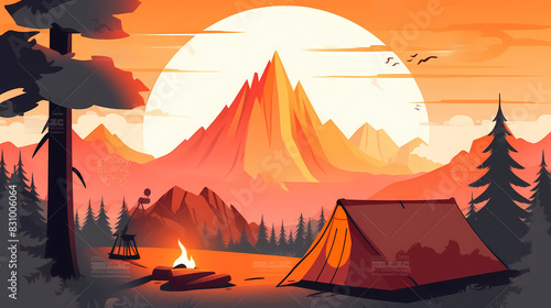 Vector camping tent in the forest.Summer camp with bonfire, tent, backpack . cartoon landscape with mountain, forest and campsite.