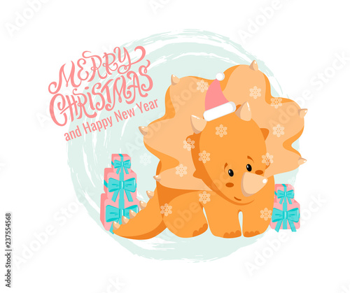 Vector Christmas and New Year greeting card with hand drawn lettering Merry Christmas, flat baby dino triceratops with gift boxes and textured background for holiday poster, dinosaur banner, printing