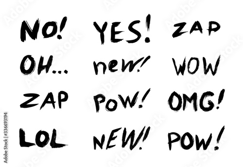 expression, message, communication, phrase, text, sticker, word, texture, grunge, graffiti, spray, sponge, real, stain, vignetting, no, yes, zap, oh, new, wow, pow, omg, lol, talk, chat, collection, banner, speak, set, speech, illustration, funny, emotion, vector, drawing, lettering, hand, abstract, template, letter, font, comic, retro, typography, label, black