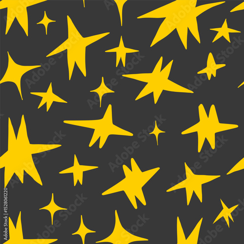 Vector doodle cartoon illustration featuring yellow whimsical stars of different shapes on dark gray background. Playful creative tile background for social media. textile design and decor