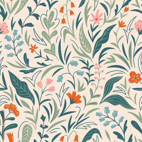 Vector floral garden seamless pattern. delicate flowers in hand-drawn style. Natural seamless design for fabric or wallpaper. Stylized flora
