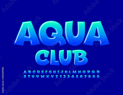 Vector funny banner Aqua Club. Gradient Blue Alphabet Letters and Numbers set. Comic style Font