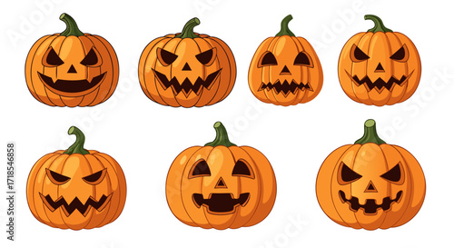 Vector Halloween Pumpkins with Carved Faces Isolated on transparent Background