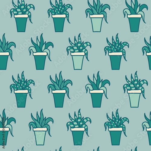 Vector Hand Drawn Aloe Pots in Pastel Green seamless pattern background.