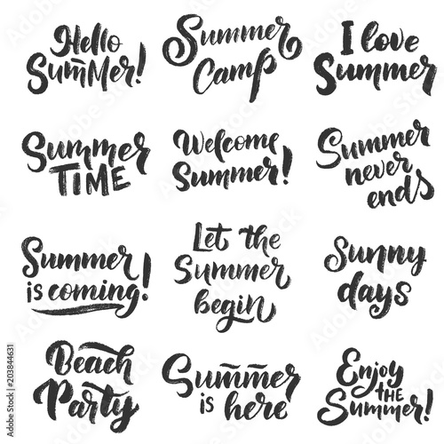 Vector hand drawn set with lettering about Summer. Isolated calligraphy for travel agency, beach party. Great design for postcard, print or poster.