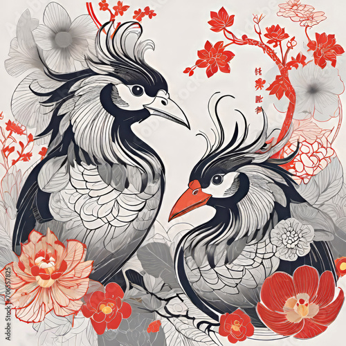 vector illustration, Chinese New Year greetings, traditional Chinese floral patterns and red lanterns, blank background for copy,