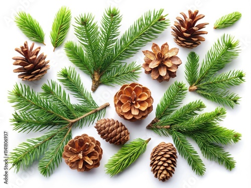 Vector illustration featuring conifer branches, pine cones, and spruce fir tree elements, perfect for winter-themed nature clipart posters against a white backdrop.