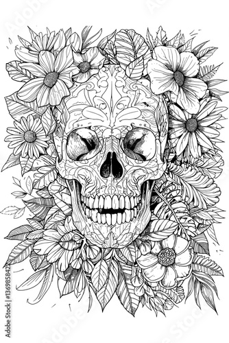Vector illustration for coloring page. A skull with flowers surrounding it