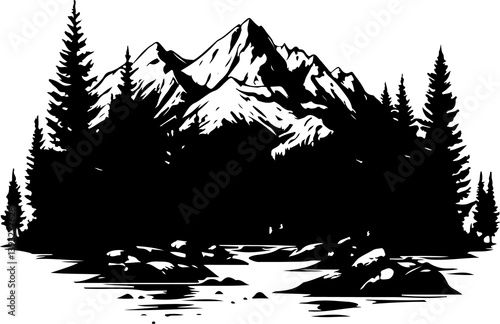 vector, illustration, nature, landscape, sketch, tree, mountain, drawing, grunge, black, silhouette, design, forest, frame, fish, art, pattern, bird, forest