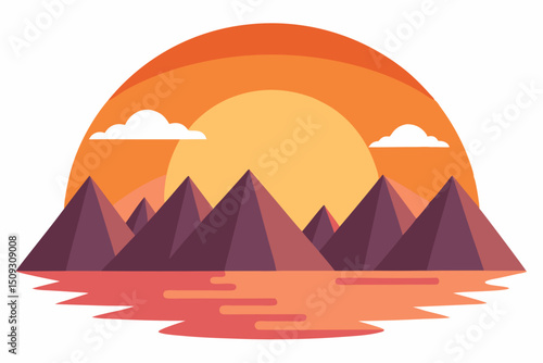 sunset, vector, egypt, landscape, sun, desert, pyramid, travel, mountain, nature, illustration, sky, sea, pyramid, tent, sand, water, tree, tour tourism, summer, egyptian, beach, design, palm, ocean