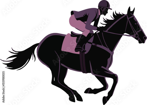 horse racing, jockey, racehorse, equestrian, sport, competition, speed, silhouette, vector, illustration, graphic, design, fast, champion, winner, track, racing, gallop, equestrianism, equine, animal, athletic, helmet, saddle, artwork, black, purple, isolated, white background, event, performance, motion, stride, thoroughbred, equestrianism, winning, victory, elegant, style, movement, dynamic, flat, minimalist, simple, icon