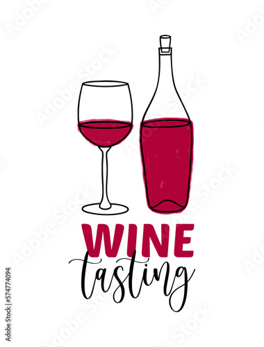 Vector illustration of bottle and glass of sweet or dry red Wine. Icon, emblem, simple sketch for café, bar or restaurant menu design. Wine tasting, wine card