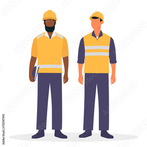 Vector illustration of constructor builders in uniform and safety helmet. Vector illustration in flat cartoon style.