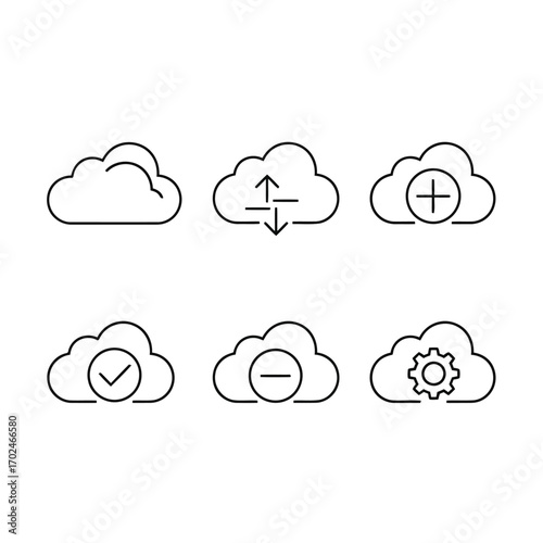 Vector illustration of set of cloud icons with various symbols like arrows, plus, checkmark, minus, and gear, representing cloud services