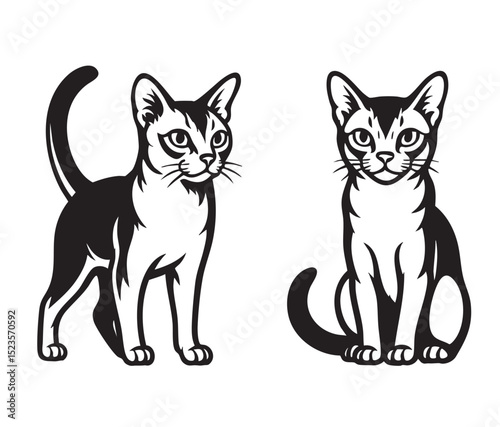 Vector illustration of Singapura cats in standing and sitting poses, black and white style, ideal for pet designs, logos, and feline-themed artwork.