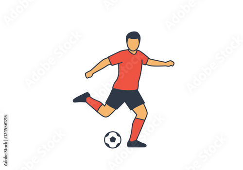 soccer, football, player, athlete, sport, action, kick, ball, game, competition, illustration, vector, graphic, design, style, flat, modern, minimalist, simple, icon, symbol, shape, figure, human, person, man, male, uniform, shirt, short, sock, shoe, black, red, orange, yellow, white, isolated, activity, motion, active, play, team, league, match, goal, field, training, exercise