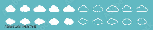 Vector illustration of the clouds set. Clouds collection flat and outline style. White cloudy set isolated on blue background. White clouds of different shapes. Collection of different white clouds.