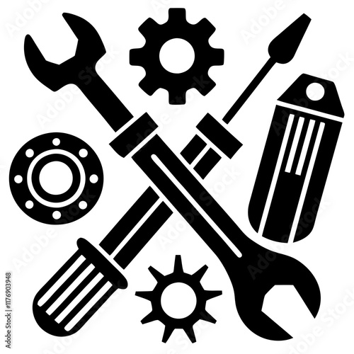 tool, wrench, gear, screwdriver, saw blade, maintenance, repair, mechanical, construction, engineering, industry, service, black-and-white, silhouette, vector, graphic, repair service, industrial, tool, equipment, fixing, automotive, machinery, industrial tool, hardware, industrial design, machine-building, repairing, outline, simple, modern, business, icon, logotype