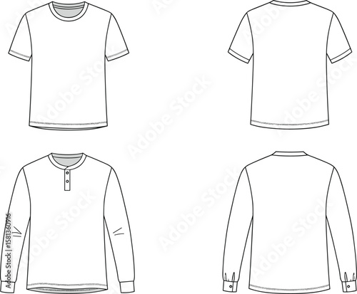 Vector illustration of T-shirt and Henley shirt templates, front and back views, fashion apparel sketch, clothing design mockup, shirt graphics for designers