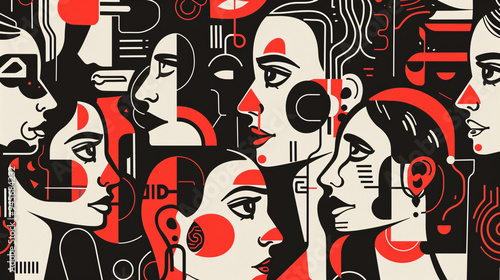 vector illustration pattern of portraits of women, red black and white head face character background patterns doodle poster outlines style comic book seamless pattern graphic