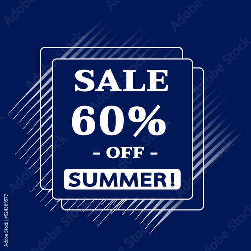 Vector illustration. Seasonal discounts. Sale 60% off summer, Blue background with white letters and square frame.