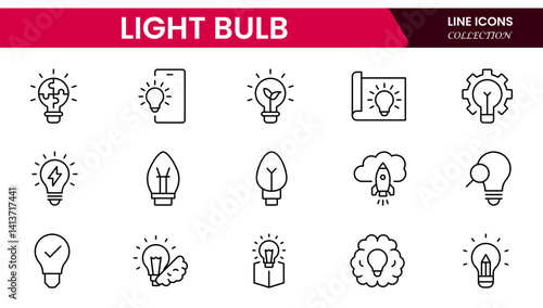 Vector illustration web line icon collection showcasing light bulb designs representing ideas, innovation, creativity, energy, solutions, thinking, inspiration, technology, brightness, and invention.