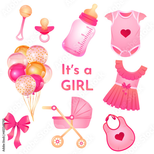 Vector illustrations collection for gender party. It's a girl stickerpak. Cards for girl, little princess, gender reveal baby shower, birthday