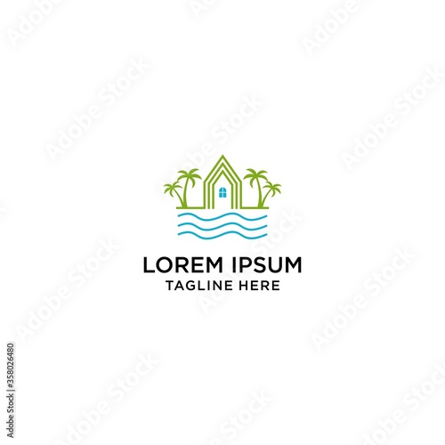 Vector image of a house on the beach, with coconut trees and sunlight around it.